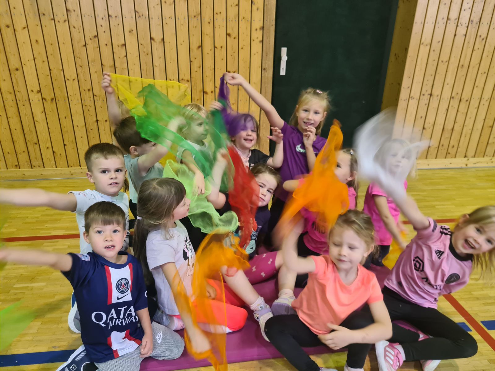 Bunte Blätter: In einer weiteren Stunde ließen wir die bunten Herbstblätter lebendig werden. Mit Chiffontüchern stellten die Kinder tanzende, fallende Blätter dar und bewegten sich kreativ durch die Turnhalle.